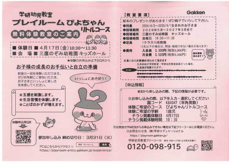 学研幼児教室プレイルームぴよちゃん HOME | プレイルームぴよちゃんリトルコース無料体験教室について Photo Diary 子どもたちのあんな顔、こんな顔。あんなこと、こんなこと。 Photo Diary 学校法人栗原学園【三鷹のぞみ幼稚園】 updated 2026-02-16 トップぺージ 園の特色 園のご案内 園の生活 【未就園児親子教室】プレイルームぴよちゃん(1~2歳) 地域教育活動 園児募集要項 アクセスマップ Photo Diary 求人案内 学校法人 栗原学園 三鷹のぞみ幼稚園 0422-43-2565(代)(平日9:00-16:00)FAX 0422-43-2563